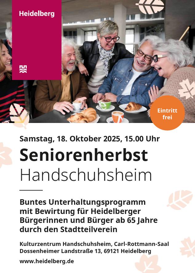 Eine Einladung in Papierform wie bisher, wird es dieses Jahr seitens der Stadt Heidelberg (Amt für Soziales und Senioren), die Mitveranstalterin ist, nicht geben.Wir würden uns dennoch über regen Besuch wie in den letzten Jahren sehr freuen und verbleiben mit besten Grüßen, hoffentlich bis zu einer Begegnung auf dem Seniorenherbst